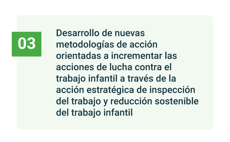 Se desarrollaron cerca de 28 proyectos en el ámbito de la Secretaría de Inspección del Trabajo del Ministerio de Trabajo y Empleo con el objetivo de “Mejorar y fortalecer la Inspección del Trabajo en la Lucha contra el Trabajo Infantil”. Los proyectos se distribuyeron en 04 grandes ejes temáticos, a saber: