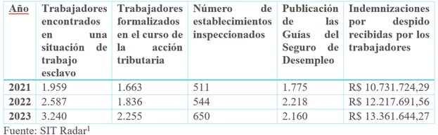 Finalmente, en el período comprendido entre 1995 (año en que se implementó la política de lucha contra el trabajo esclavo en Brasil) y 2023, se encontraron 63.516 trabajadores en una situación análoga a la esclavitud; con 54.783 relaciones laborales formalizadas en el curso de acciones fiscales; 7.323 establecimientos inspeccionados; 43.479 guías de Seguro de Desempleo emitidas; y un total de R$ 148.628.505,54 recibidos por los trabajadores, en concepto de indemnización por despido.