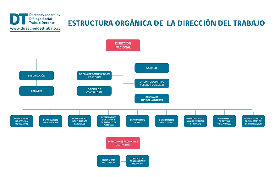 La Dirección del Trabajo se organiza mediante su Dirección Nacional compuesta por cuatro departamentos operativos..