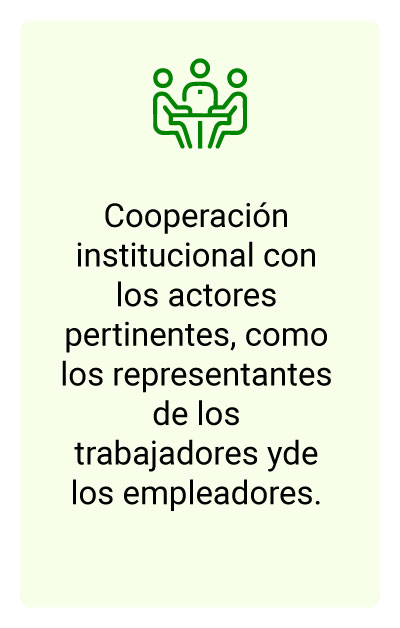 • Promover el empleo mediante la creación de un entorno institucional y económico sostenible;desarrollar y fortalecer las medidas de protección social; promover el diálogo social y el tripartismo; respetar, promover y aplicar los principios fundamentales del trabajo.